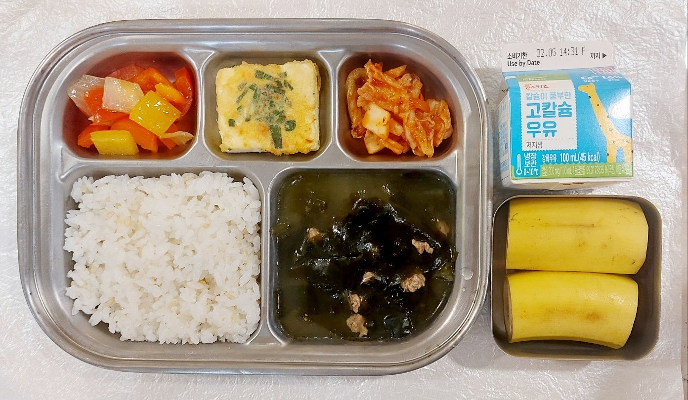 2024.2.5(월) 중식식단 (현미밥, 미역국, 두부달걀부침, 파프리카양파무침, 배추김치 (후)바나나, 우유)