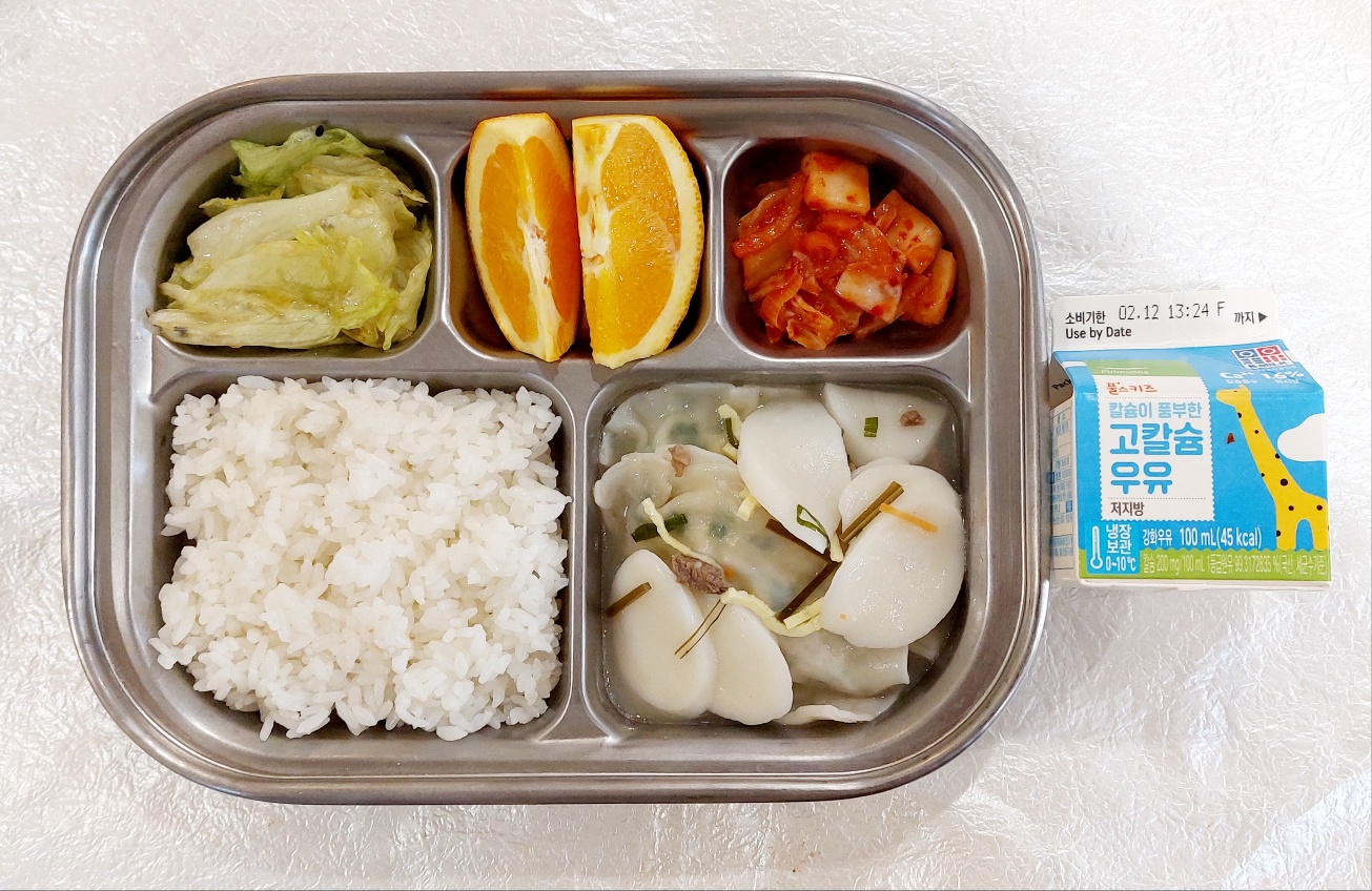 2024.2.8(목) 중식식단 (백미밥, 소고기떡만둣국, 양상추샐러드, 배추김치 (후)오렌지, 우유)