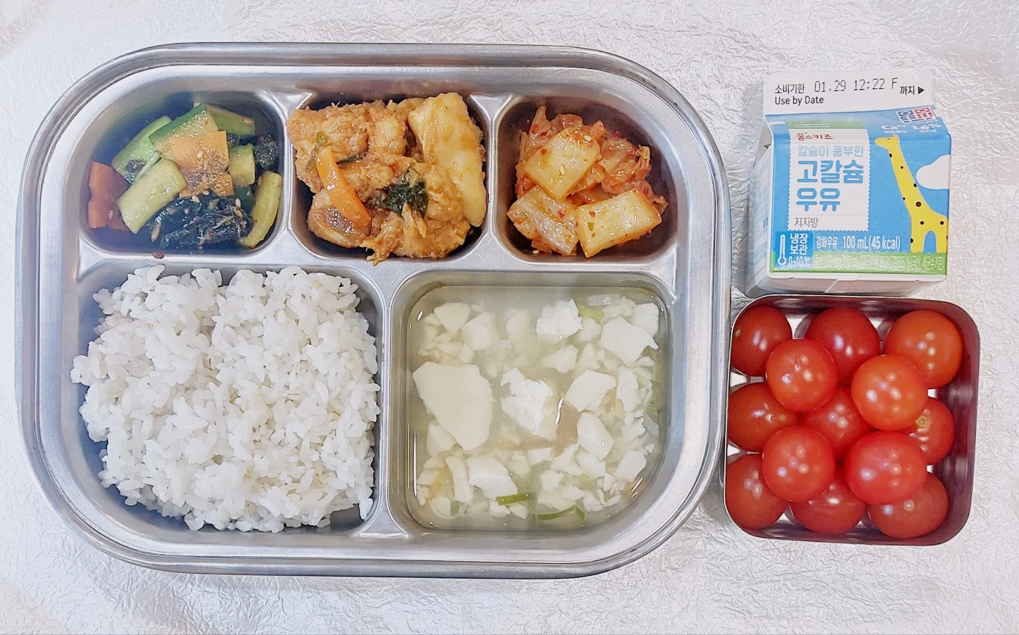 2024.1.23(화) 중식식단 (보리밥, 순두부백탕,닭살양념구이,깻잎나물,배추김치(후)방울토마토, 우유)