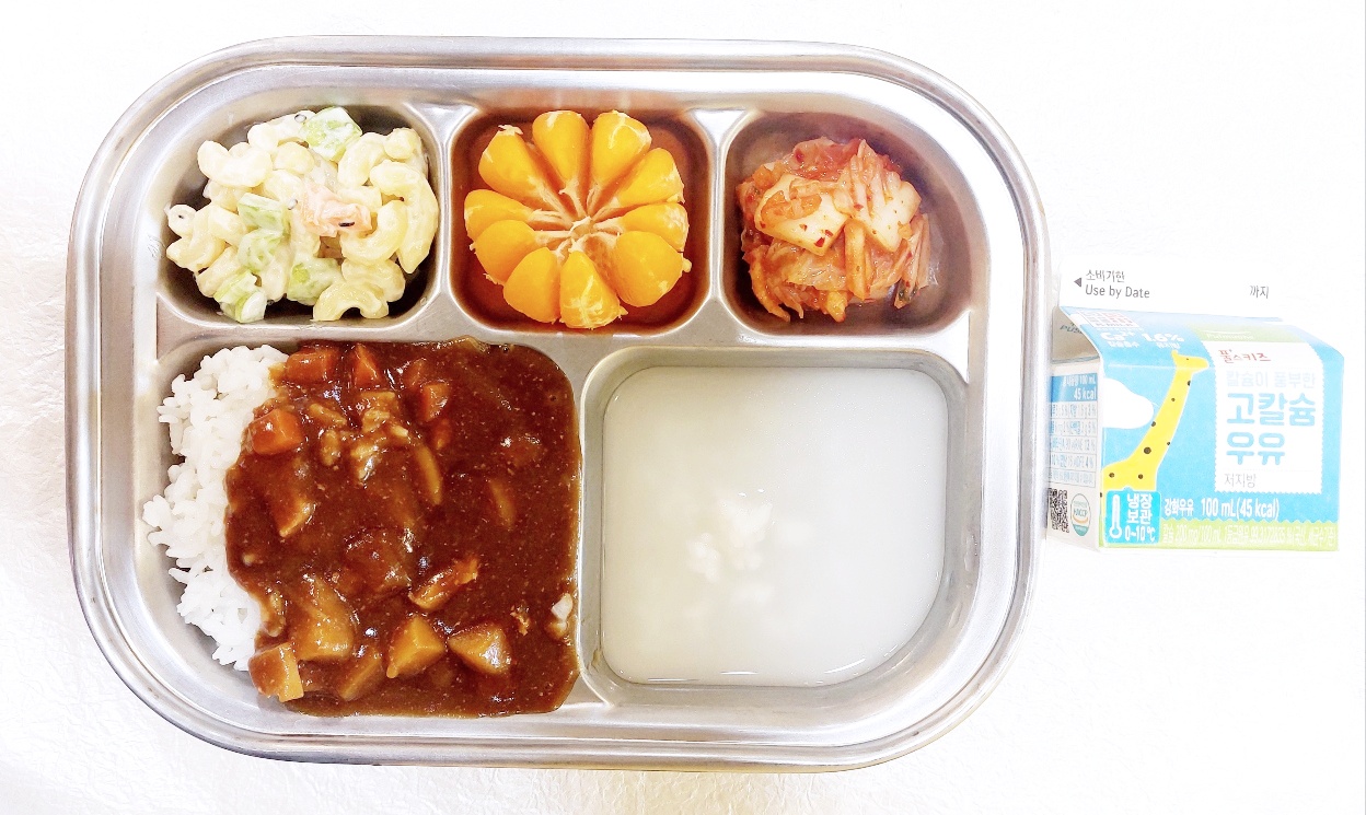 2024.1.24(수) 중식식단-국없는데이 (돼지고기하이라이스, 숭늉, 마카로니오이샐러드, 배추김치(후)귤, 우유)