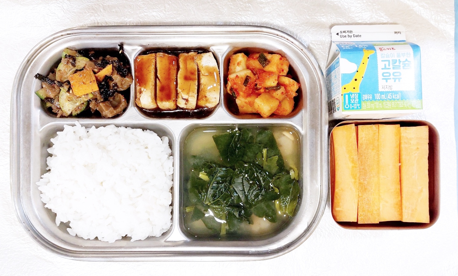 2024.1.25(목) 중식식단 (백미밥,새우살시금치맑은국, 두부데리야끼조림,도토리묵무침, 깍두기(후)당근스틱, 우유)