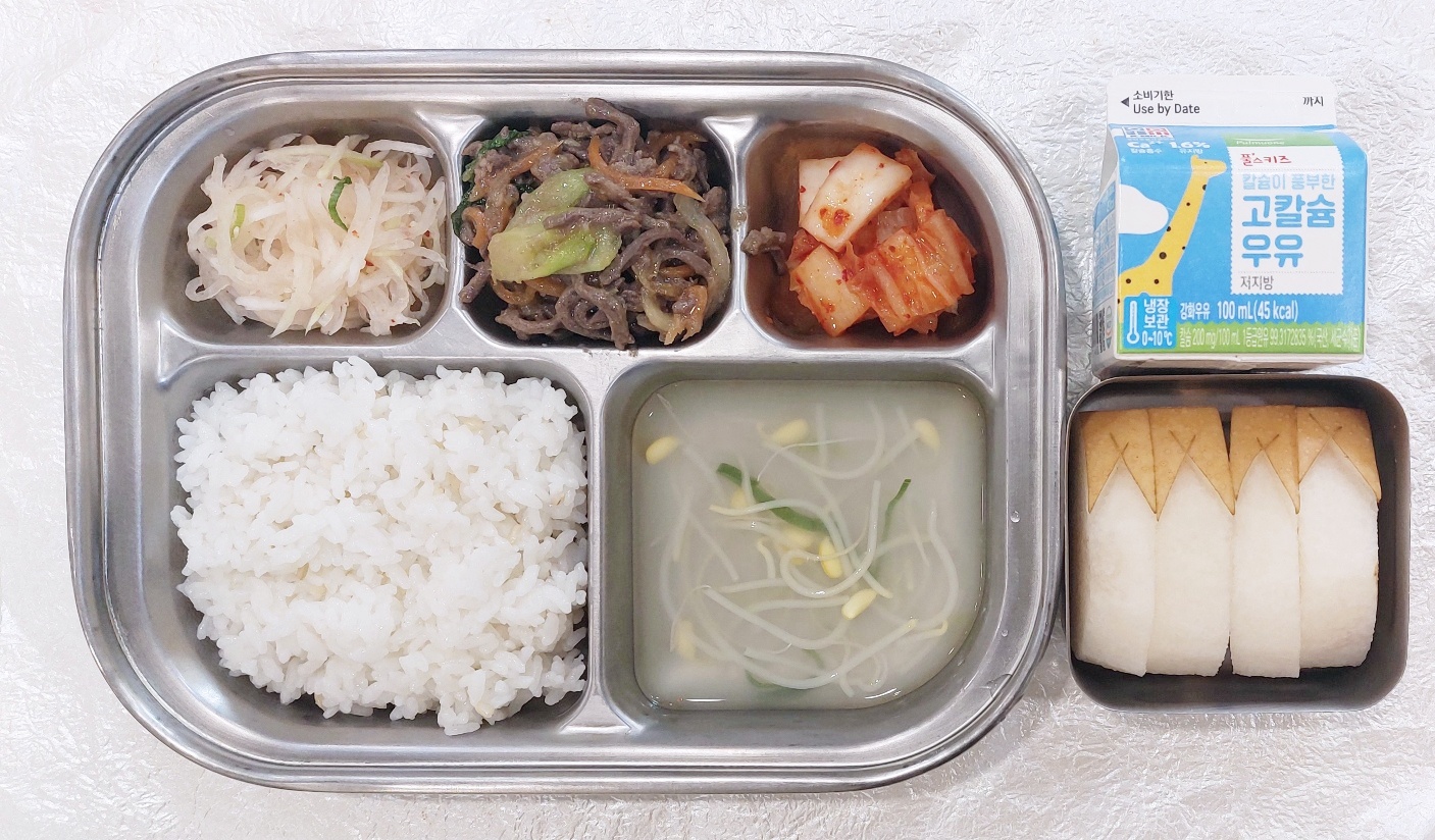 2024.1.26(금) 중식식단 (현미밥, 콩나물국, 쇠고기청경채볶음, 무생채, 배추김치 (후)배, 우유)