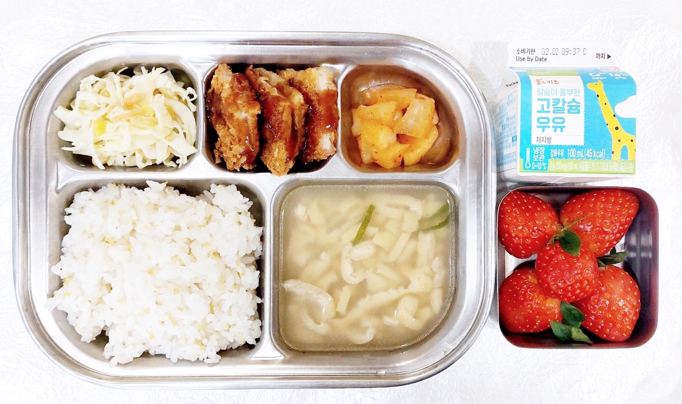 2024.1.29(월) 중식식단 (기장밥, 유부된장국, 돈까스&소스,양배추콘샐러드, 깍두기 (후)딸기, 우유)