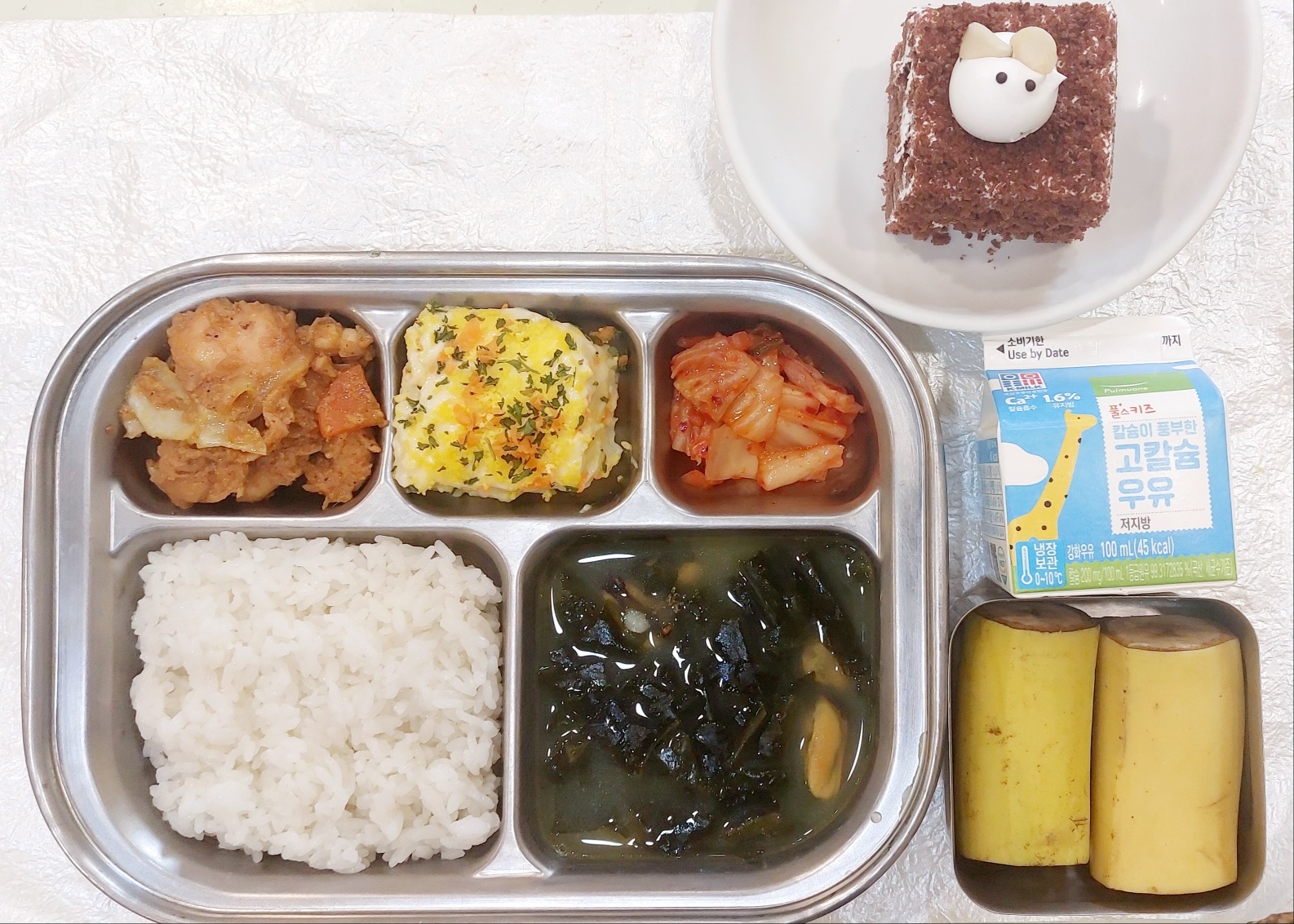 2024.1.30(화) 중식식단 ( 백미밥, 홍합살미역국, 닭살양념찜, 감자샐러드,배추김치 (후)케이크, 바나나, 우유)