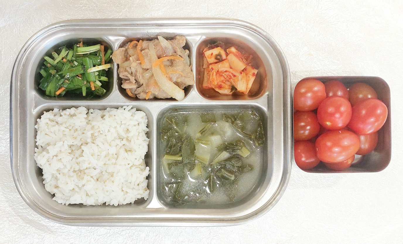 2024.1.15(월) 중식식단 (차조밥,콩가루근댓국,,돼지불고기,부추겉절이,배추김치(후)방울토마토)