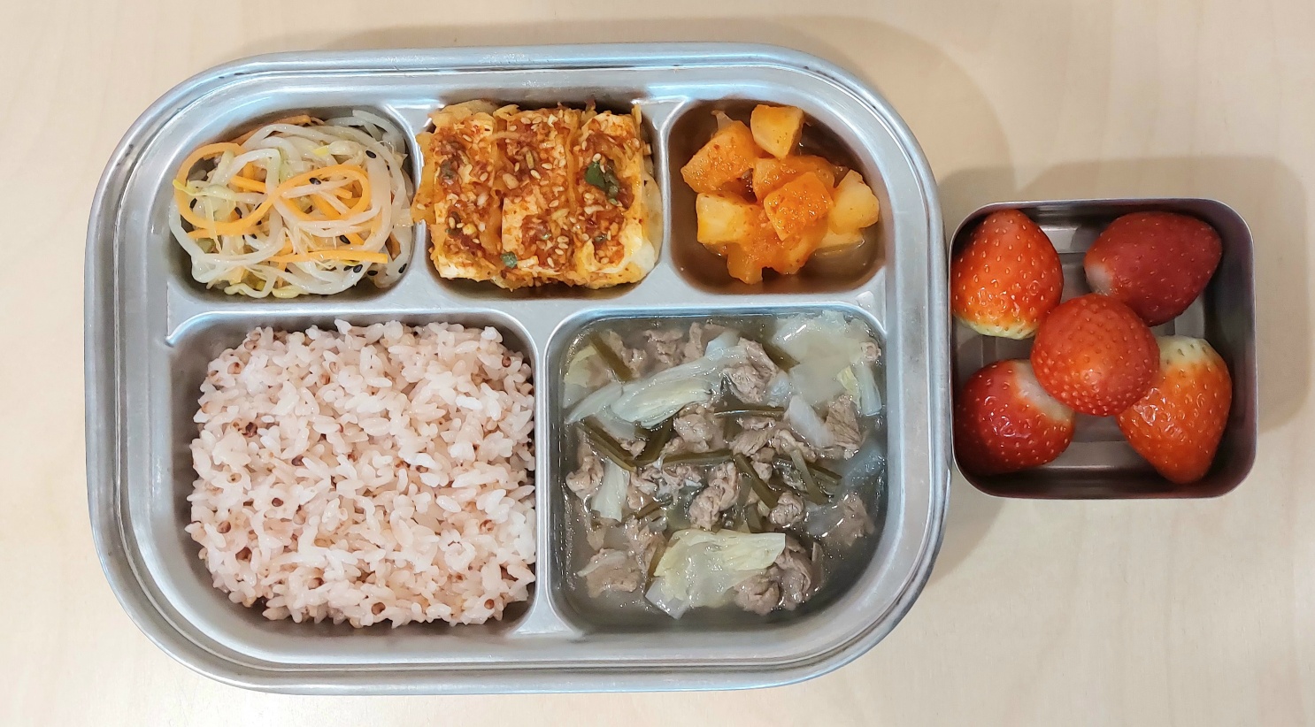 2024.1.18(목) 중식식단 (수수밥, 쇠고기전골,두부구이&달래장,당근숙주나물,깍두기(후)딸기)