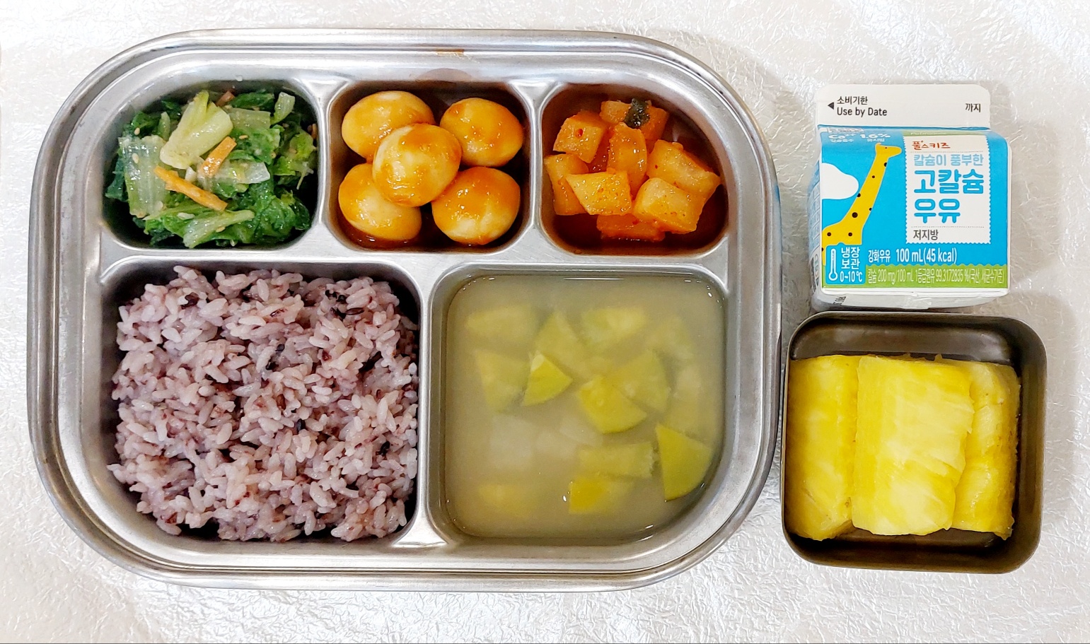 2024.1.22(월) 중식식단 (흑미밥,애호박된장국,메추리알파프리카폭찹, 얼갈이무침, 깍두기(후)파인애플, 우유)