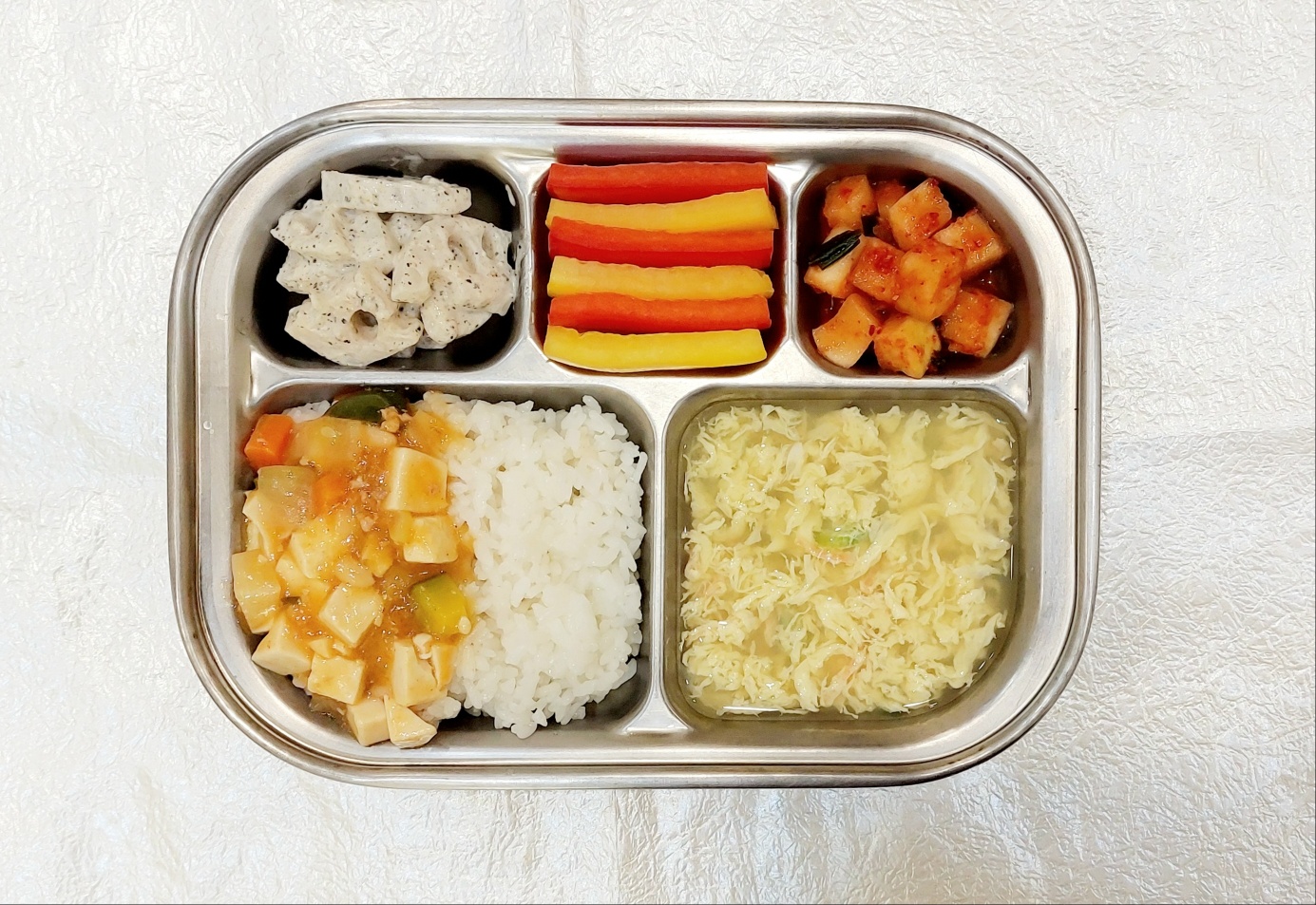 2024.1.10.(수) 중식식단 (마파두부덮밥, 달걀팟국, 연근깨소스무침, 깍두기, (후)파프리카스틱)