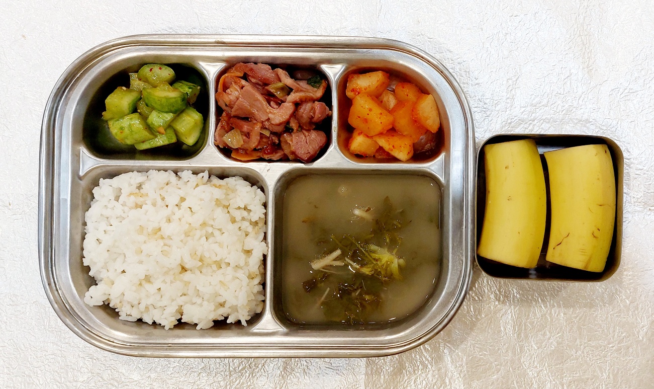 2024.1.9.(화) 중식식단 (현미밥, 냉이된장국, 훈제오리대파볶음, 오이무침, 배추김치,(후)바나나)