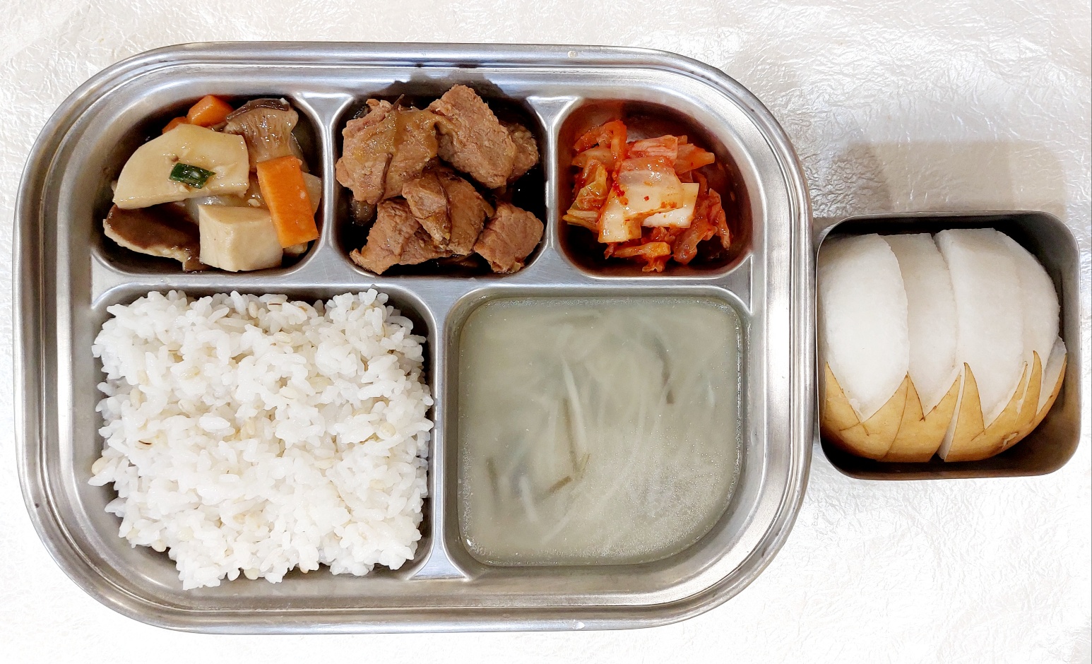 2024.1.11(목) 중식식단 (보리밥, 다시마무챗국, 돼지고기장조림, 새송이버섯볶음, 배추김치, (후)오렌지)
