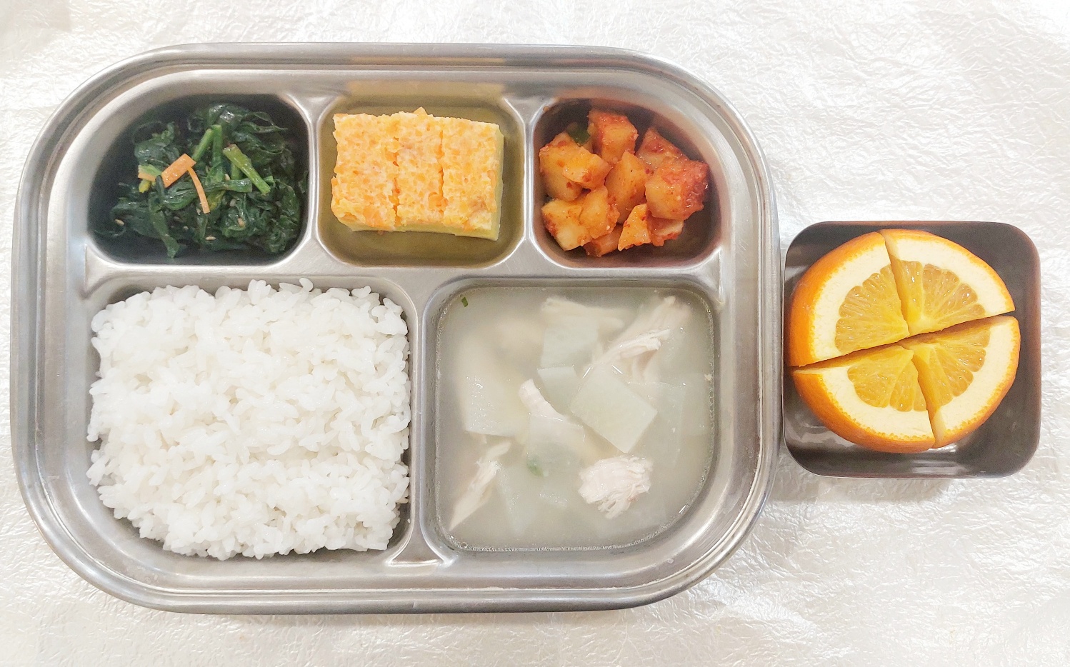 2024.1.12(금) 중식식단 (백미밥,닭곰탕, 당근달걀찜,시금치나물, 깍두기 (후)오렌지)