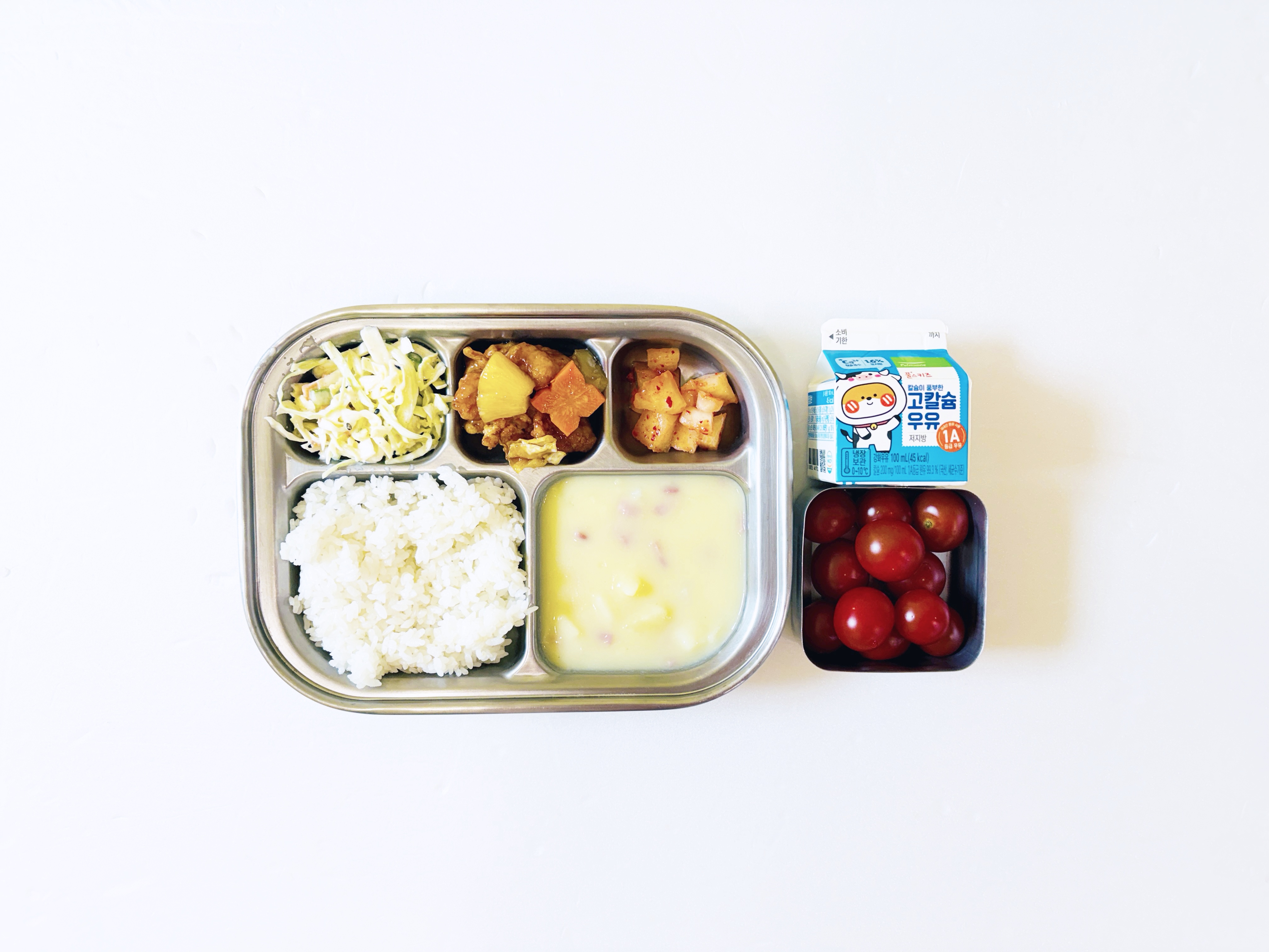 2026.4.3 (금) 중식식단 - 아침간식: 우유 / 백미밥,베이컨감자스프,과일닭살탕수,양배추샐러드,깍두기 (후) 방울토마토 작성자 : 관리자 26-04-03 Next 2026.4.6 (월) 중식식단 - 아침간식: 우유 / 차조밥, 청경채된장국,돼지갈비찜,연근들깨무침,깍두기 (후) 오렌지 Prev 2026.4.2 (목) 중식식단 - 아침간식: 우유 / 기장밥,달걀양팟국,두부데리야끼조림,열무나물,배추김치 (후) 떠먹는 요구르트 목록